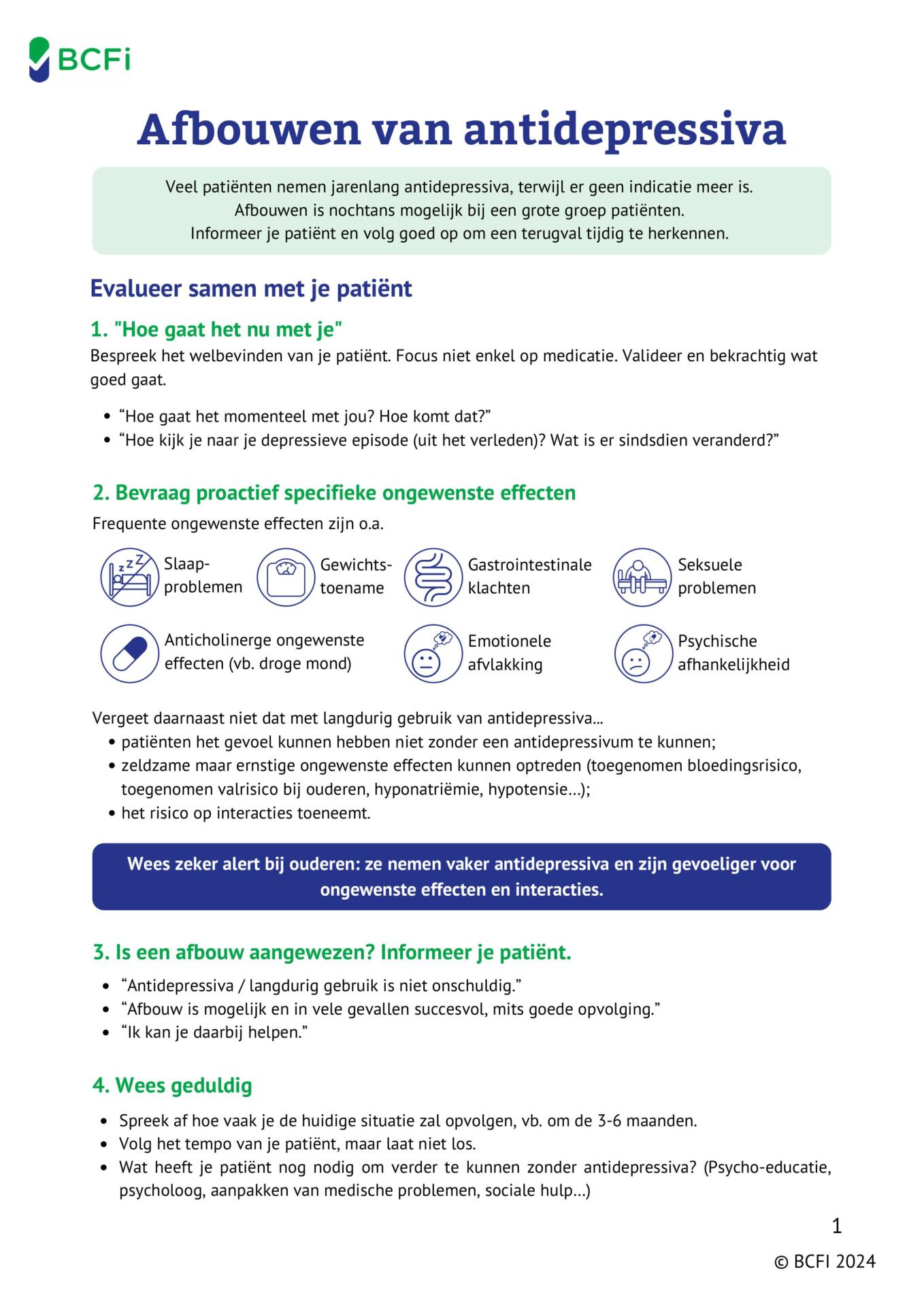 In de e-learning ‘Afbouwen van antidepressiva‘ ontdek je hoe je een patiënt informeert, motiveert en begeleidt bij het afbouwen van antidepressiva. In een samenvattende fiche voor je praktijk zetten we alle tips op een rij. In de afbouwschema’s vind je voor elk antidepressivum concreet advies.